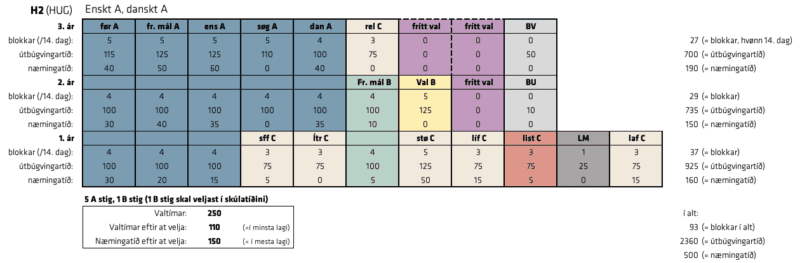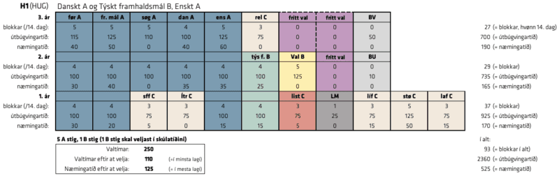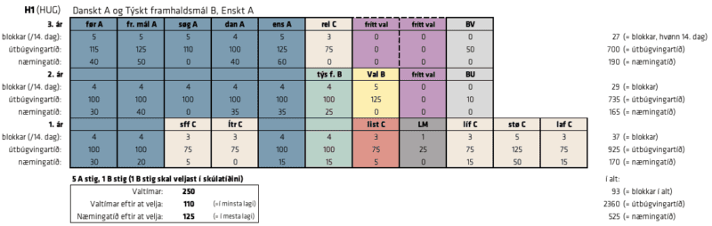 Leiðirnar H1 og H2 hava 5 A stig og 2 B stig. Á H1 hevur skúlin valt danskt A og týskt B. Tú skal bara velja Fremmandamál A og listalærugrein. Á H2 hevur skúlin valt eitt mál afturat tí kravda á breytini (Danskt A), so tú skal velja Fremmandamál B og fremmandamál A.