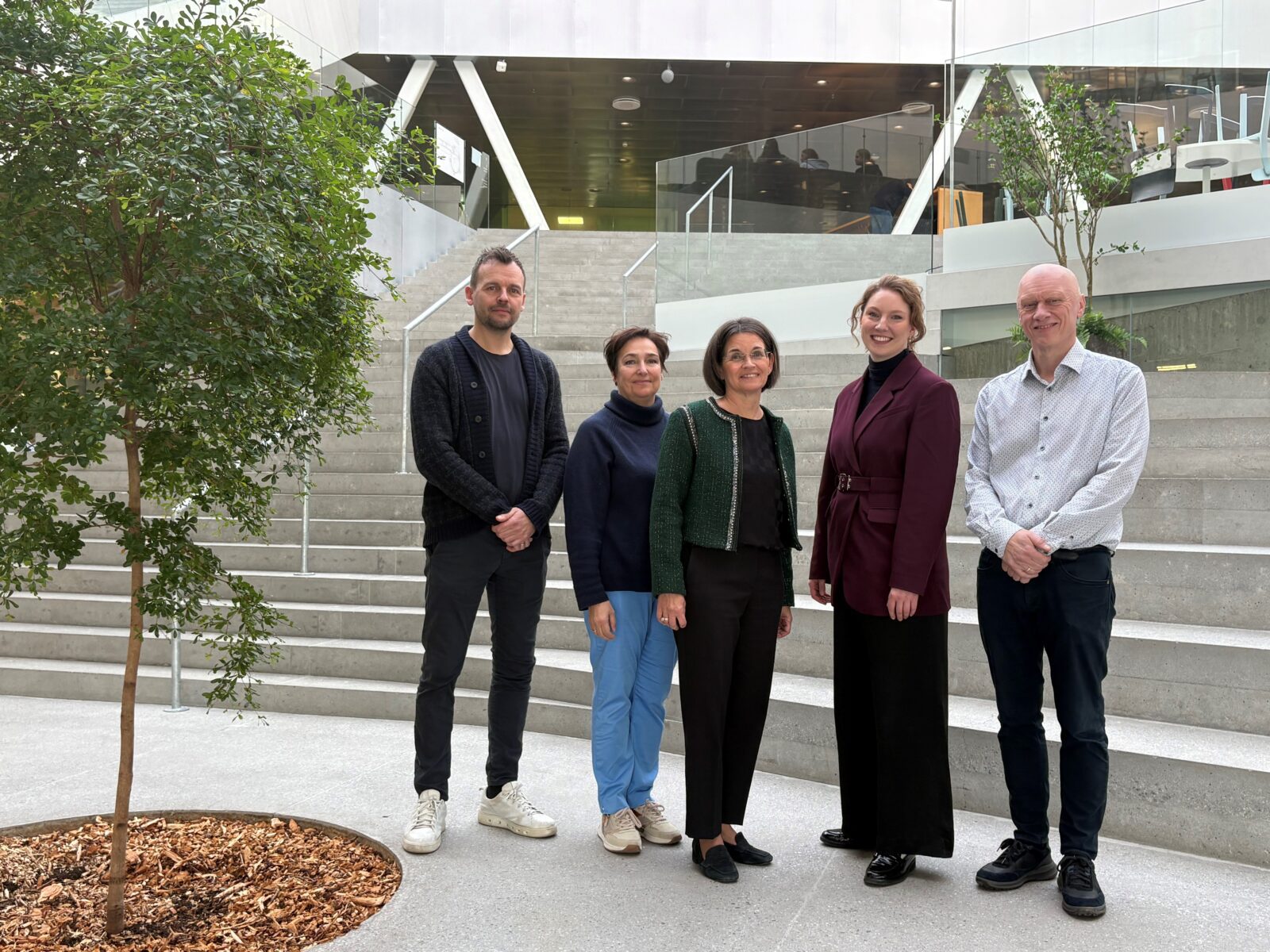 Á myndini omanfyri síggjast frá vinstru: Magni á Lakjuni, vararektari, Annie Fjallsá, stjóri fyri Næmingatænastuna, Una Joensen, rektari, Elsa Berg, borgarstjóri, og Jóan Petur Hentze, kommunustjóri í Tórshavnar kommunu.