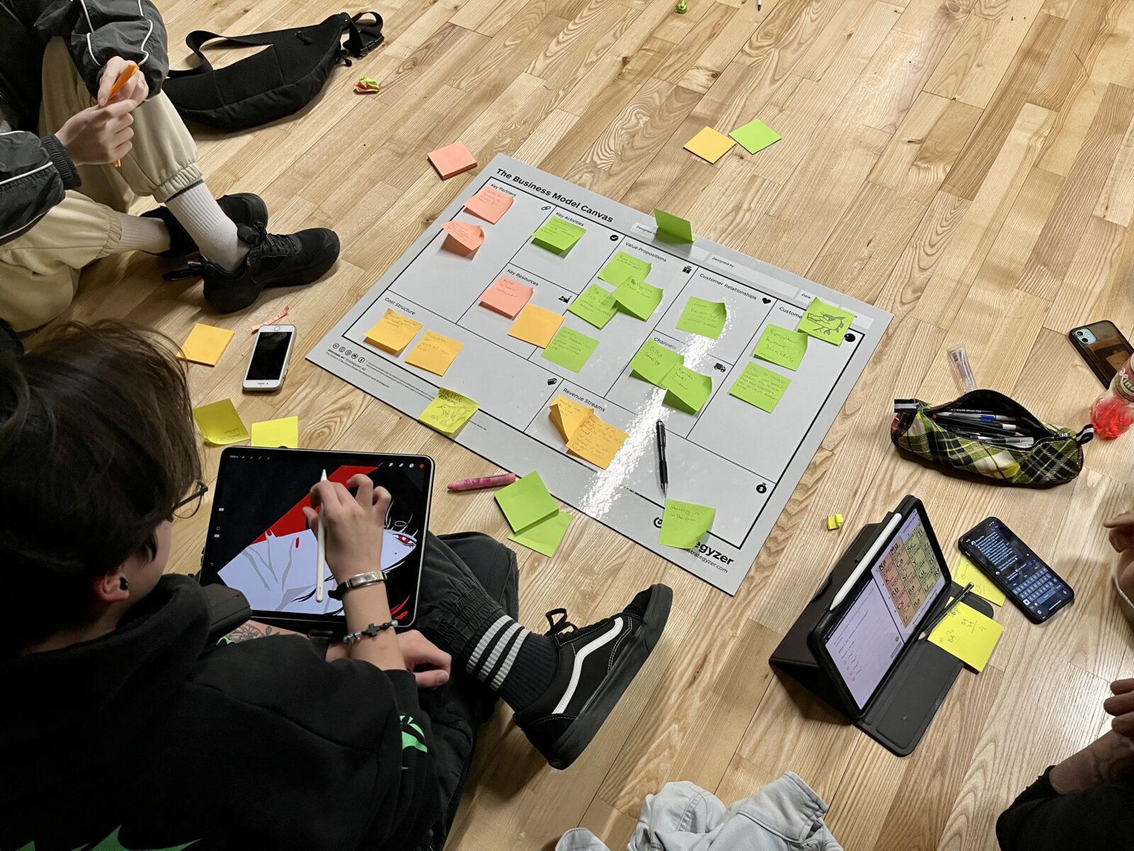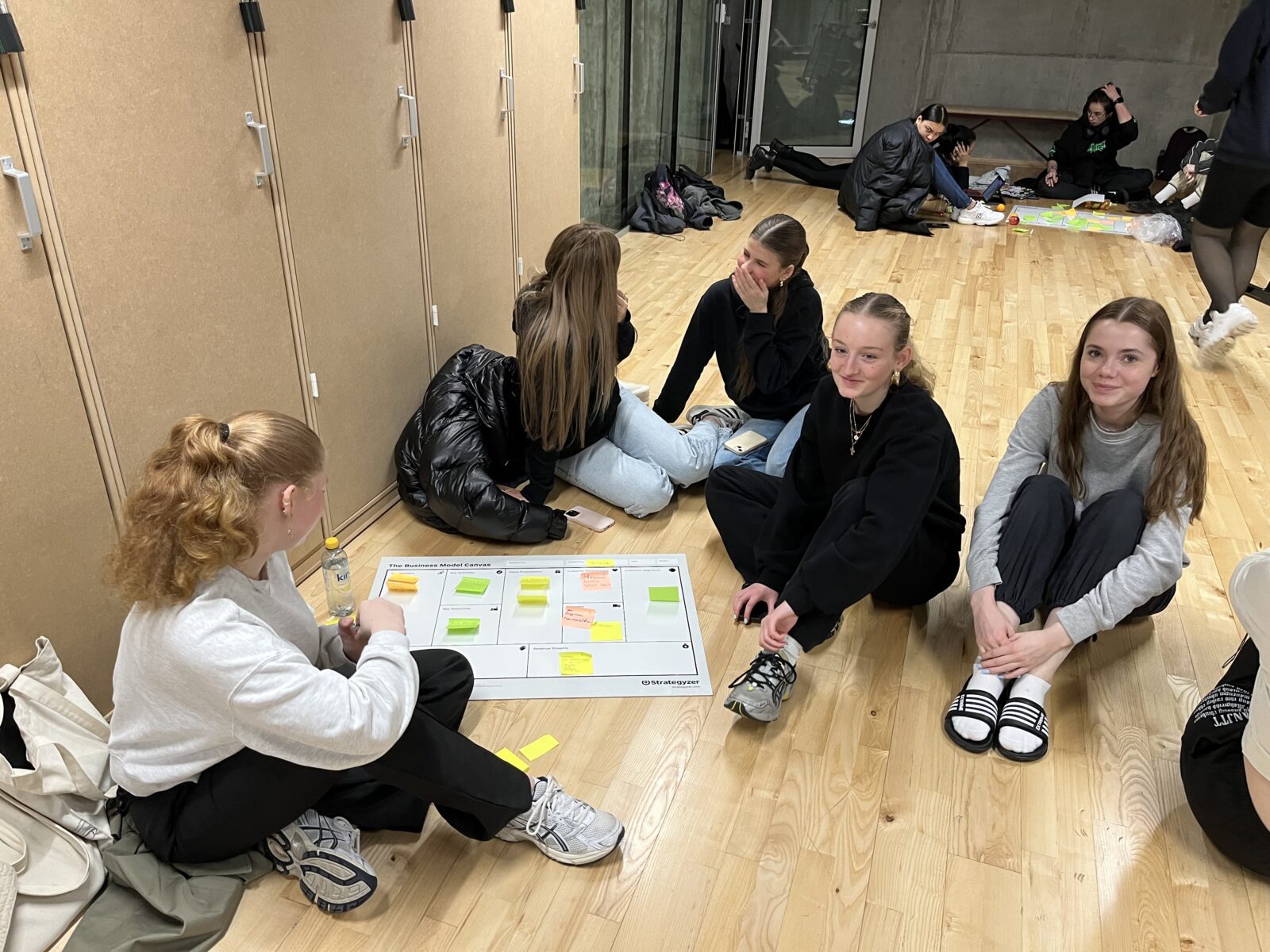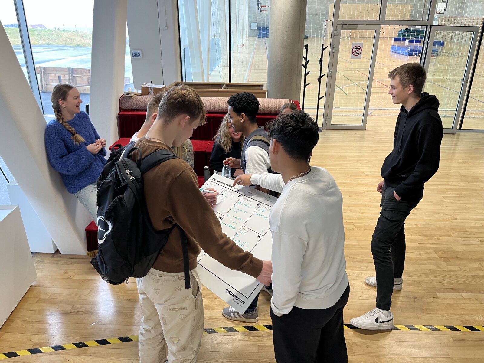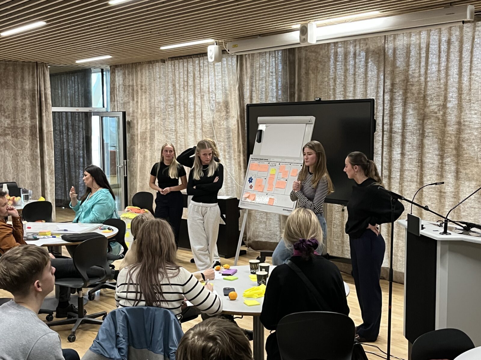 Sóley Hammer og Súsanna Laursen úr Hugskotinum í Havn presenteraðu næmingunum fyri einum relativt nýggjum amboði innan hugskotsmenning, sum kallast Business Model Canvas.