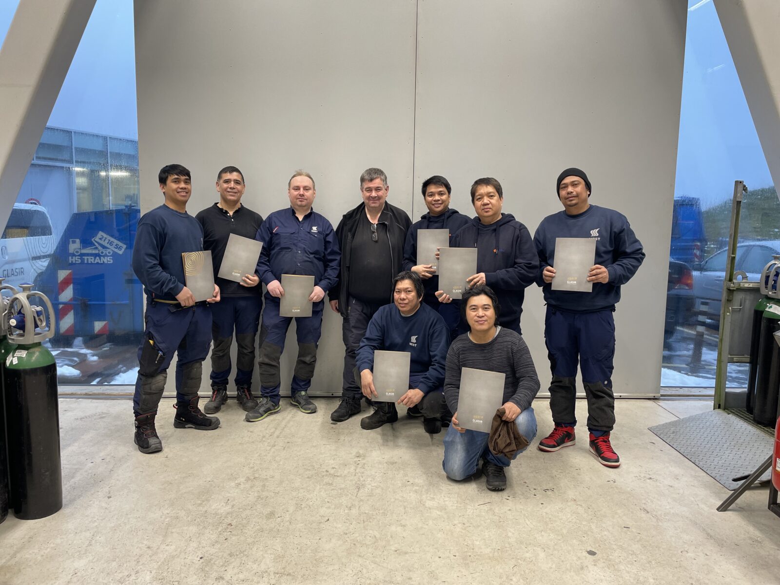 Allir 8 sveisarar fáa sertifikat frá Norsk Veritas fyri at hava ment hesar førleikar.