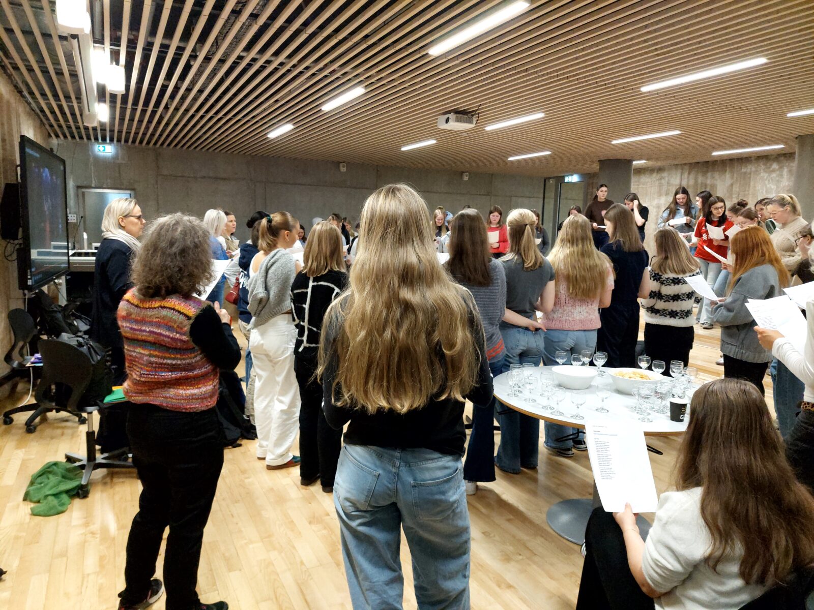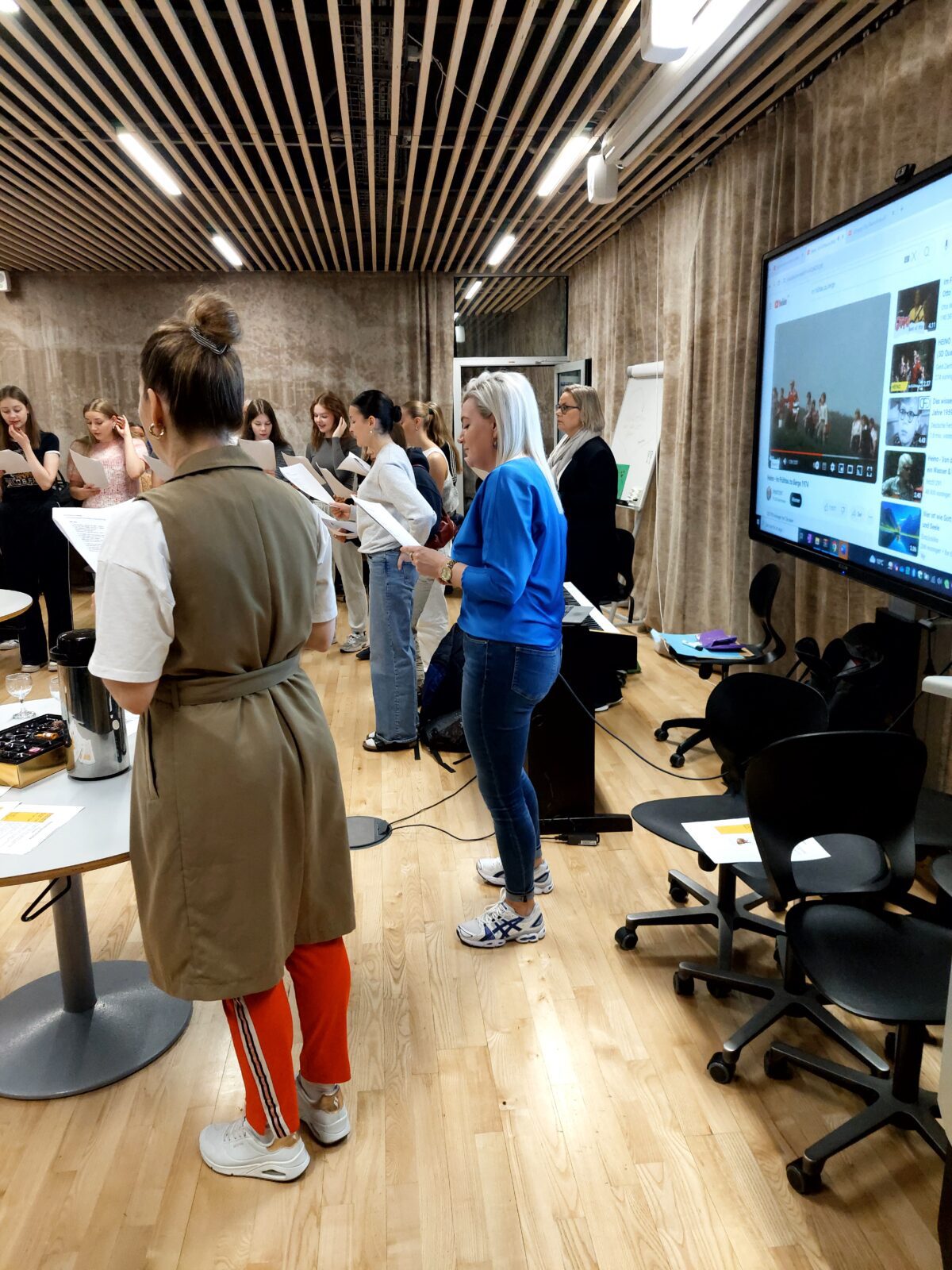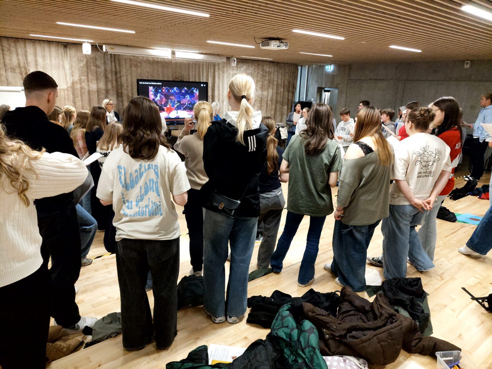 Umleið 65 næmingar og 7 lærarar hittust til ein spennandi dag, har skipað varð fyri ymiskum samansjóðandi aktiviteti, sungið varð á týskum og Guðrið Højgaard frá Visit Faroe Islands greiddi frá týdninginum av at duga ymisk fremmandamál í vaksandi føroysku ferðavinnuni.