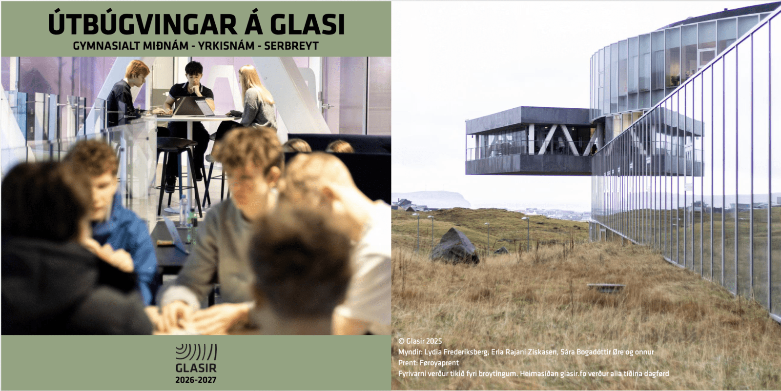 Bóklingurin um útbúgvingarmøguleikar á Glasi fyri komandi skúlaár er nú tøkur á heimasíðu okkara á leinkinum niðanfyri. Trýst á myndina fyri at lesa faldaran, ella vitja heimasíðubústaðin glasir.fo/faldarin.