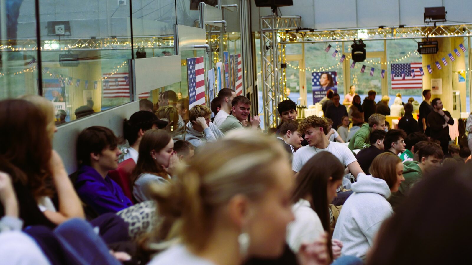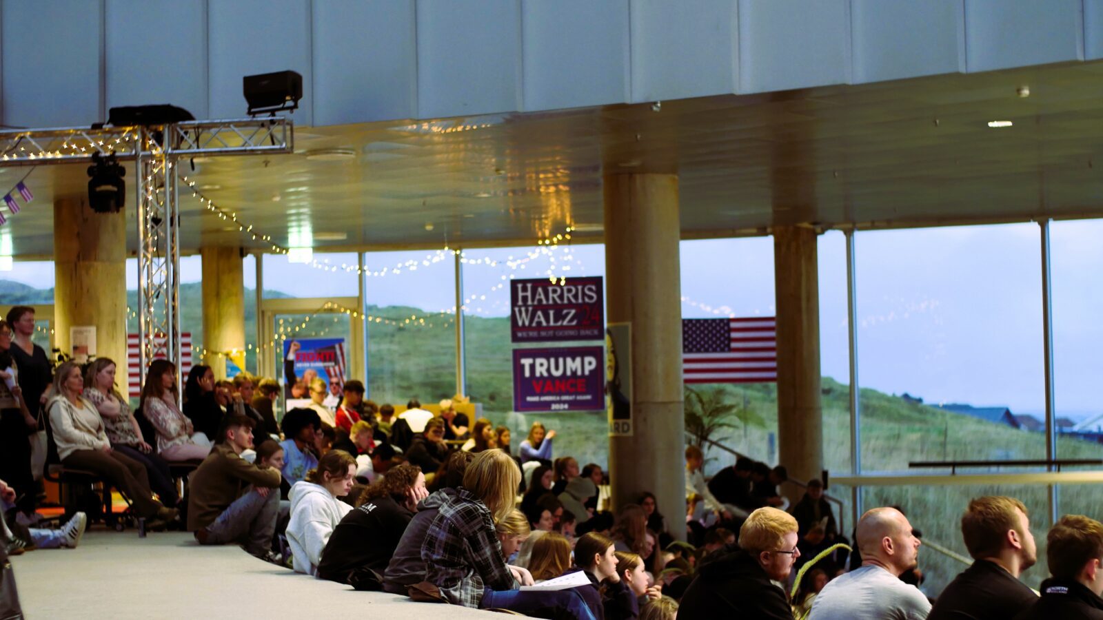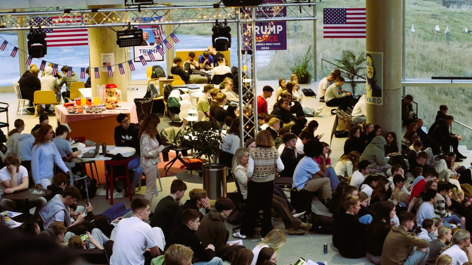 Gott 250 næmingar og starvsfólk vóru savnaði til tiltakið um forsetavalið í USA í Atrium týsdagin 5. november. Fakbólkurin í samfelagsfrøði og næmingaráðið eru væl nøgd við undirtøkuna.