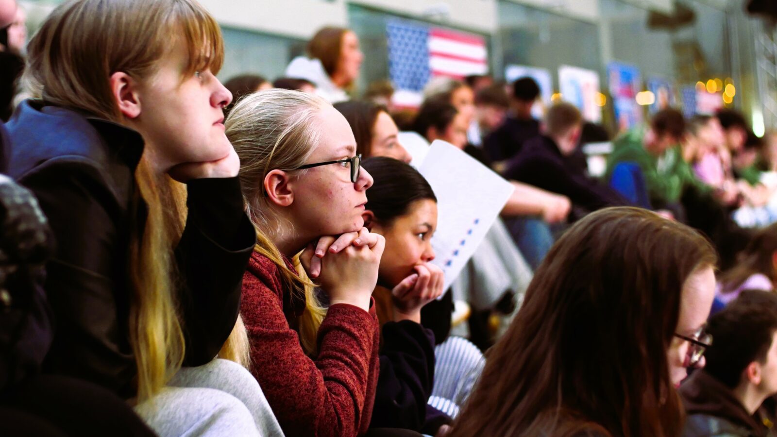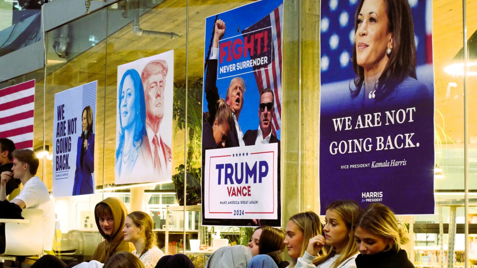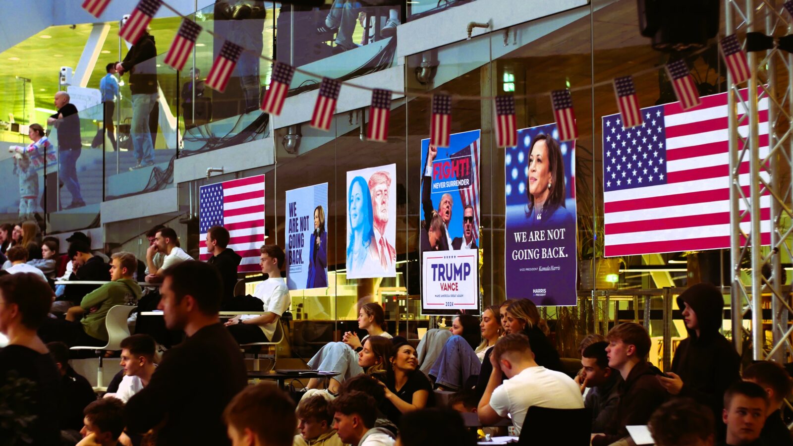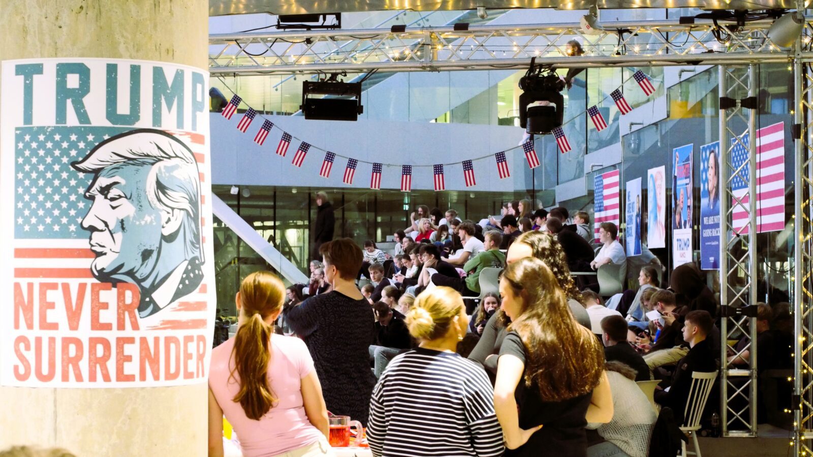 Gott 250 næmingar og starvsfólk vóru savnaði til tiltakið um forsetavalið í USA í Atrium týsdagin 5. november. Fakbólkurin í samfelagsfrøði og næmingaráðið eru væl nøgd við undirtøkuna.
