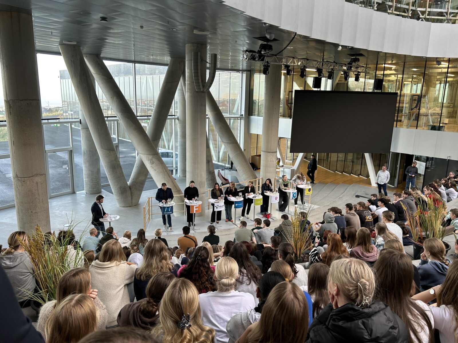 Fleiri hundrað næmingar, lærlingar og starvsfólk lýddu á, tá valevnini bóru fram sín boðskap til pallborðskjakið, ið orðstýrarin Rógvi Olavson leiddi. Pallborðskjakið gekk væl og fleiri áhugaverdir spurningar vóru frá áhoyrarunum.